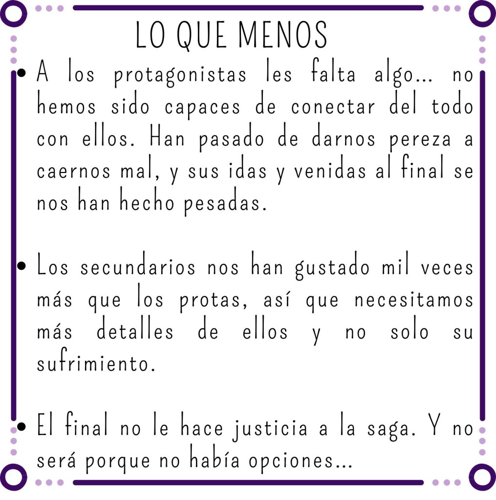 Lo que no nos ha gustado nada es el desenlace. Nos parece el típico final “fácil” de historia simple y una saga tan compleja como esta, merecía concluir de forma apoteósica. Nosotras esperábamos fuegos artificiales y nos encontramos con una de petardos.