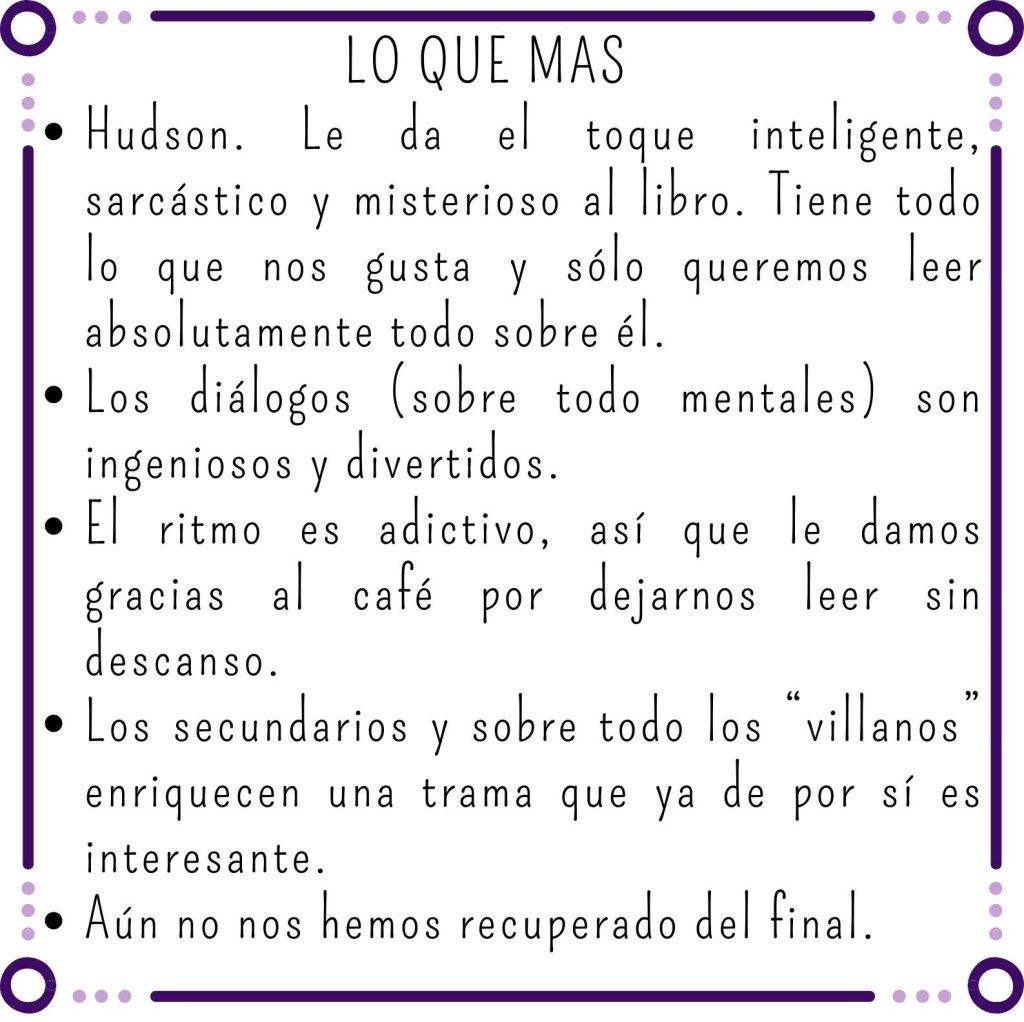 Pero siempre hay algo, o en este caso alguien, que hace que le perdonemos a la autora la denuncia por jodernos el personaje de Jaxon. En este caso es Hudson, el hermano (¿muerto?) de Jaxon, que ha sido como agua de mayo y como ver la luz al final del túnel. Y es que este personaje lo tiene todo (o todo lo que nos gusta), es sarcástico, inteligente, poderoso, tiene una lengua afilada que nos encanta, una forma de pensar peculiar y una fuerza brutal (en todos los aspectos). Es el contrapunto y a la vez el complemento perfecto para Grace y Jaxon.