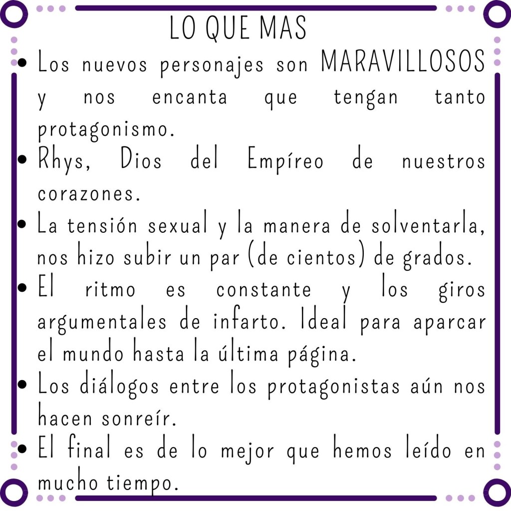 Todo sucede entre la Corte Primavera y la Corte Noche. Parece que tras matar a Amarantha todo va a ser felicidad, pero NO. La guerra está a punto de empezar, una guerra que no solo afecta a los Fae sino también a los humanos. Se necesitan alianzas, pactos… también se necesita debilitar de alguna manera al otro bando de la guerra. Y ahí empieza todo. Nos sumergimos de lleno en una trama de supervivencia, y en múltiples subtramas donde la política, los secretos, la manipulación y el poder entran en juego. Todas y cada una de las cosas que suceden son importantes y todo tiene un por qué… en este libro amigas, no se da puntada sin hilo.