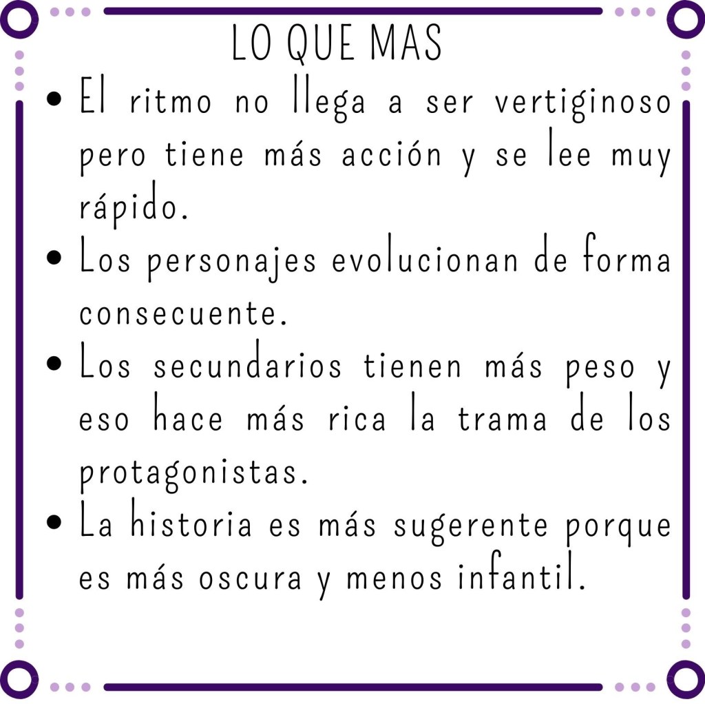 Lou y Reid deben escapar pero no lo hacen solos, así que las relaciones con el resto de personajes también serán importantes, igual que las estrategias y los secretos. Este libro es mucho más oscuro que el anterior, tiene más conflicto y más misterio, porque cualquier decisión que toma un personaje tiene una acción/reacción difícil, y eso nos ha encantado.