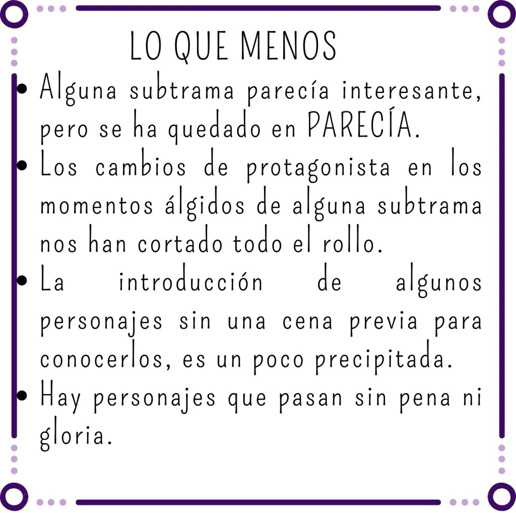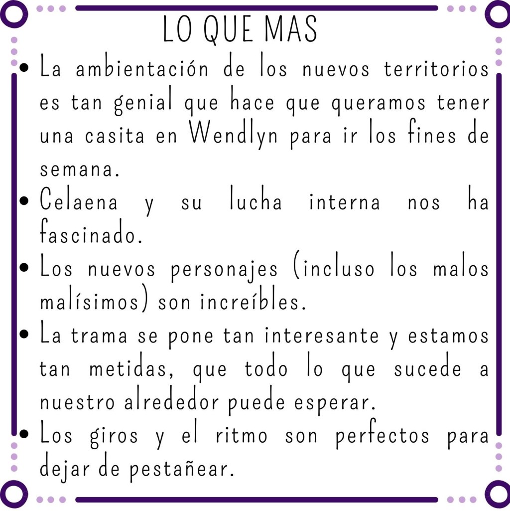 Así que aunque la trama principal ya no era introductoria, presentar ciertas subtramas sí lo era, y eso, pudo ser puntualmente lento. La acción tarda en llegar, pero cuando llega, coge un ritmo vertiginoso que te sube a una montaña rusa de emociones lectoras.