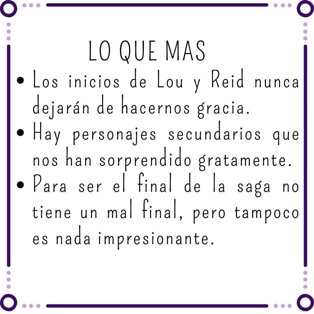 Hasta la mitad del libro no hemos podido ver a la Lou que nos gusta, y la hemos echado de menos, pero cuando llega, lo hace por la puerta grande. Hemos disfrutado viéndola “indefensa”, asumiendo sus miedos y sin cortarse a la hora de expresar lo que siente. Ha aceptado que su futuro depende de sus decisiones y que no hay nada ni nadie que la pare para cumplir sus objetivos. “Recordar” los inicios con Reid y ese tira y afloja verbal nos ha sacado más de una sonrisa.