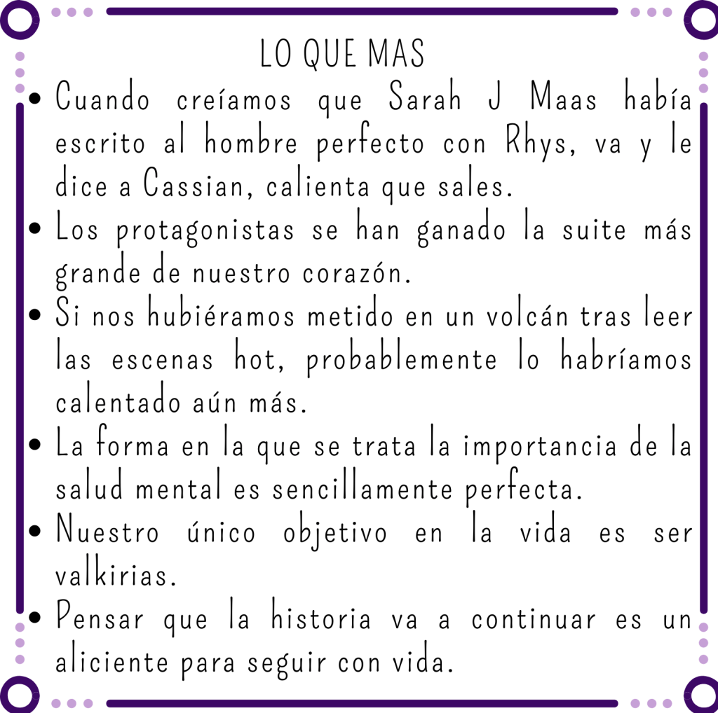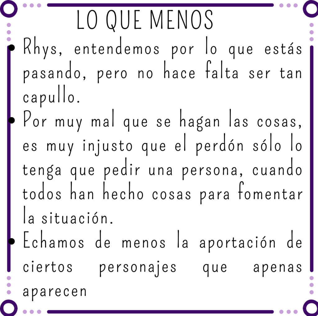Los personajes secundarios no han tenido tanto peso en esta trama, pero cada aparición que hacían era como meter a un grupo de cheerleaders en nuestra cabeza. Y es que, a quién no le alegra la existencia leer a Feyre, Rhys, Mor, Azriel y compañía…