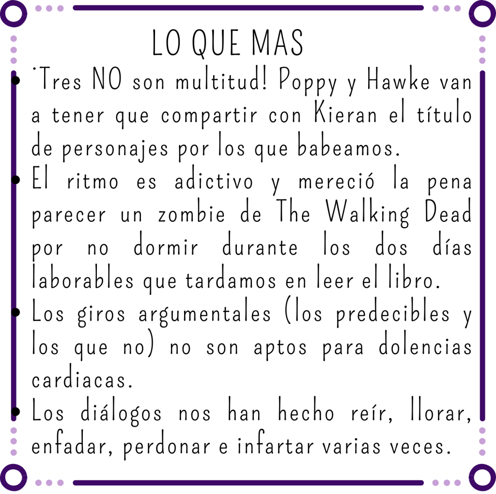 Pero si hay un personaje del que nos hemos enamorado incondicionalmente es Kieran. Ya nos gustó al final del anterior libro y en este simplemente hemos caído rendidas a sus pies. Sus diálogos tienen un toque ácido e inteligente que no nos podían hacer más gracia, su relación con Poppy nos tiene hipnotizadas porque cuando habla con ella es como la voz de su conciencia y lo único que esperábamos eran sus comentarios en todo lo que va sucediendo.