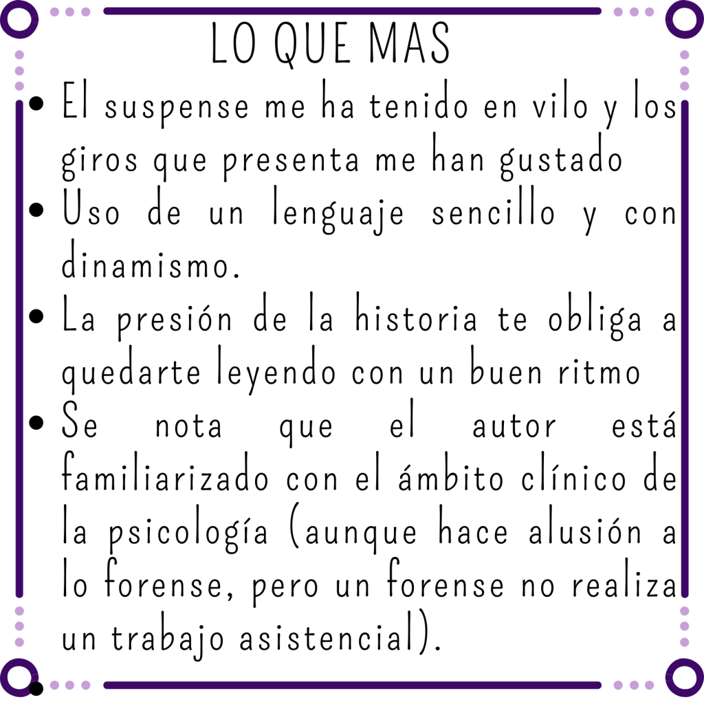 Lo que podría ser un libro más sobre un psicólogo loco por tratar patologías, se adentra en el mundo forense WOW. ¡Qué buen atrevimiento para el autor! Y sí, esta es la razón por la que me puse a leer este libro, no suelen tratar bien el campo forense dentro de las novelas, por lo que me llenó de curiosidad.