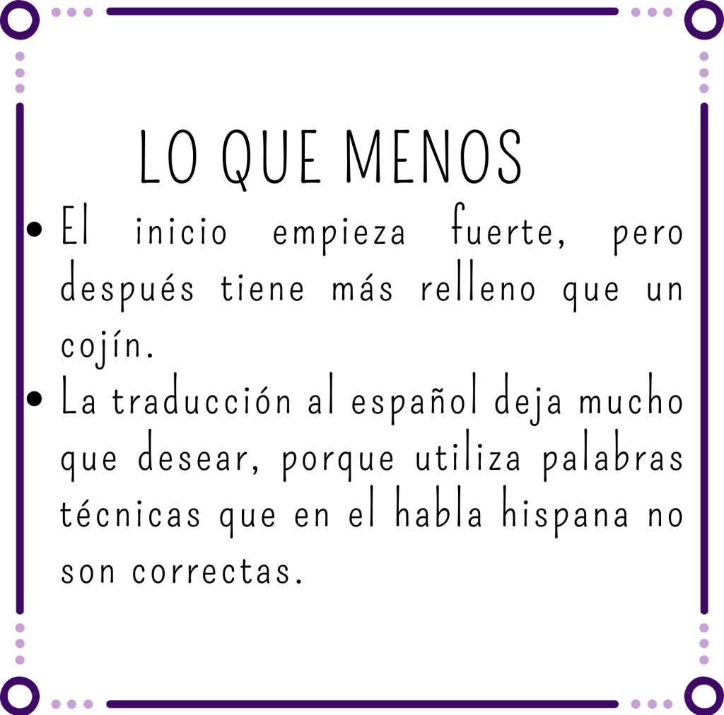 En términos generales es un libro que me ha gustado y me ha resultado entretenido, pero versión de habla inglesa, ya que el uso de ciertos “términos” debido a la traducción estaban haciendo que mi cerebro explotara y llorara lágrimas de sangre.