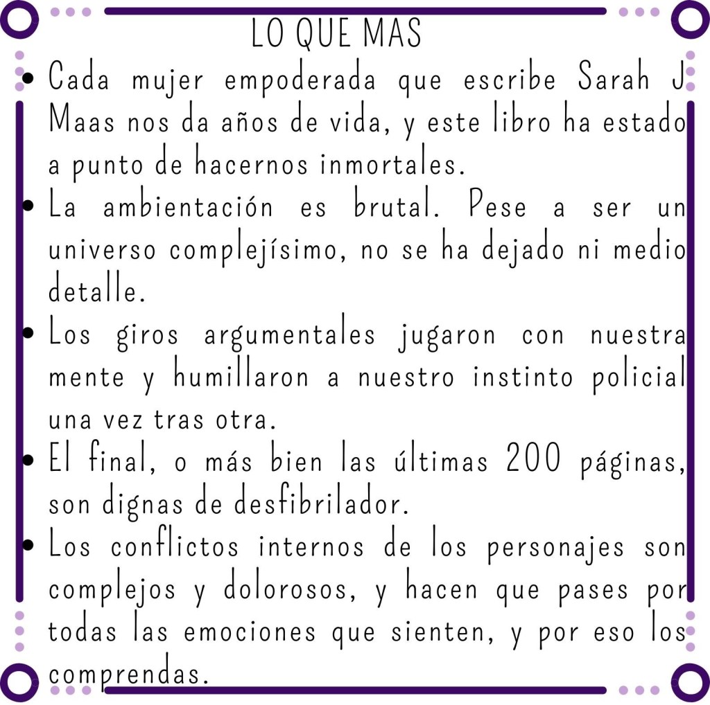 Pero claro, es un libro de Sarah J Maas, y eso quiere decir que en algún momento sabíamos que iba a pasar algo que nos iba a obligar a despedirnos del mundo para quedarnos pegadas a las páginas comentando cada coma. Y efectivamente eso pasa, y el ritmo pega un acelerón que no te esperas haciendo que llegues al final habiéndote olvidado de comer, de dormir y prácticamente de respirar.