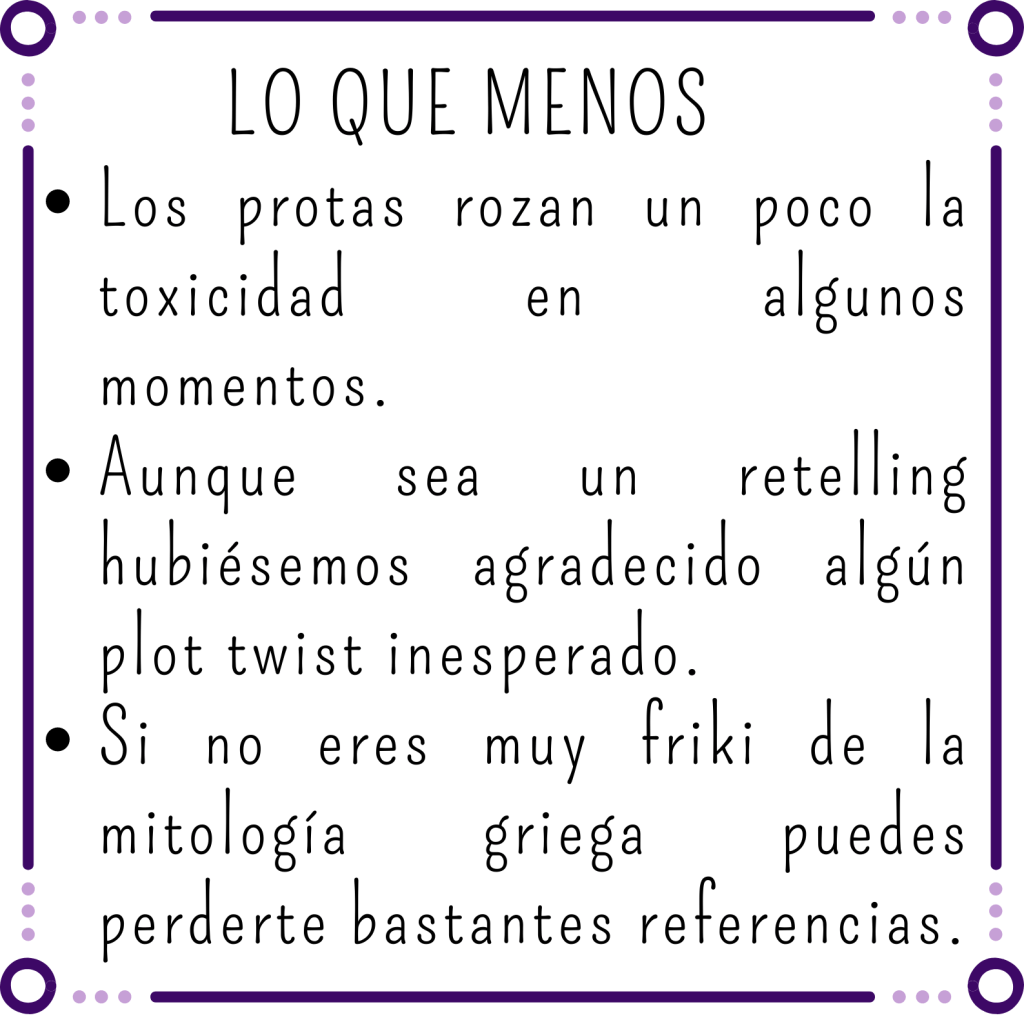 La trama en sí no tiene grandes plot twist si sabes un poco de qué va el mito. Además, es un enemy to lovers de manual, llenito de clichés, incongruencias y red flags por todos lados.