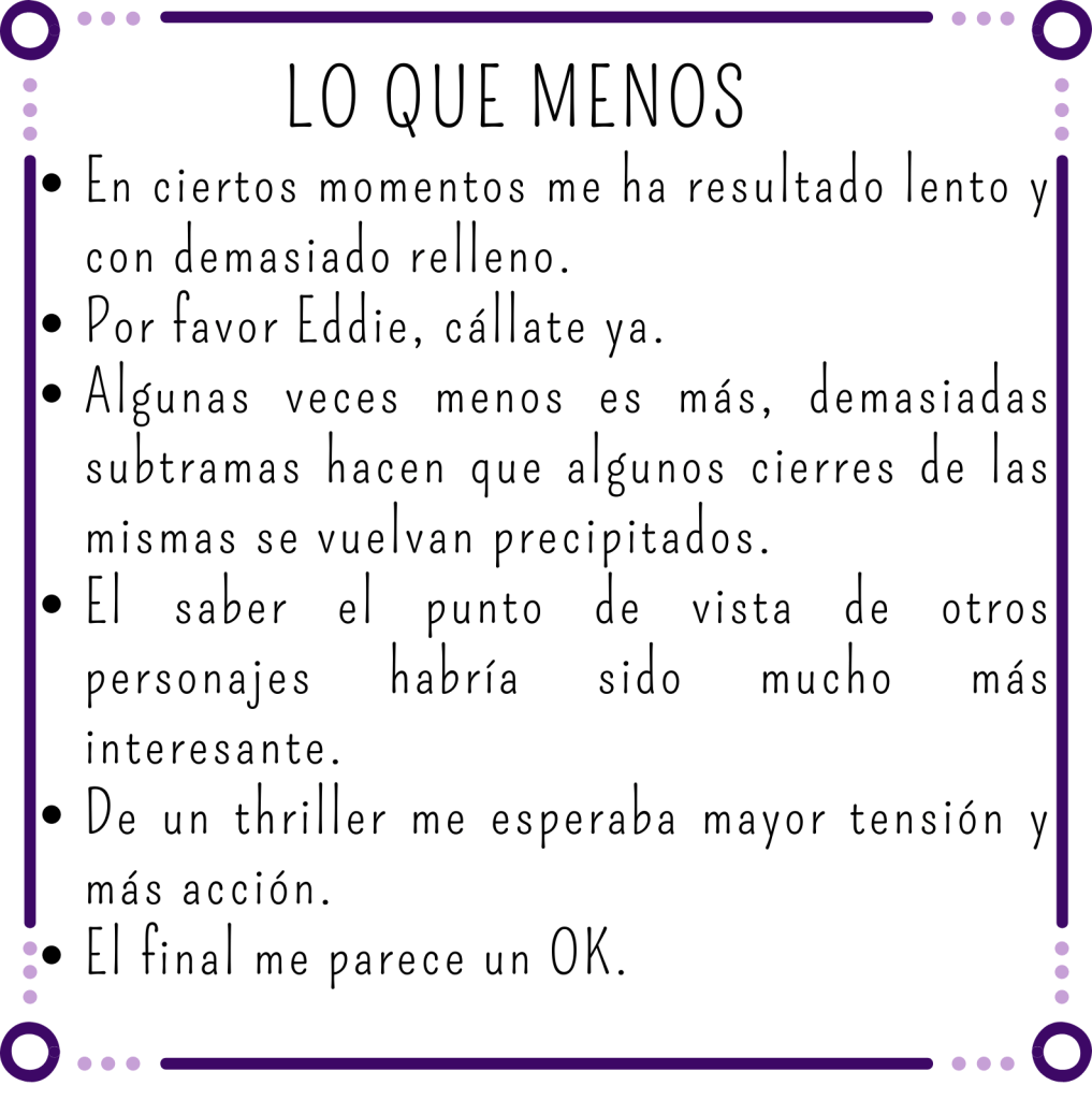 Si que es verdad que tras leer la sinopsis tenía las expectativas un pelin altas. Esperaba mayor tensión e incluso sentir miedo junto a los protagonistas. Me habría encantado, tener mayores perspectivas de lo sucedido, y que el narrador no fuera solo Eddie, ya que las subtramas no son sólo sobre él, y para mi eso deja un poco coja la historia.
