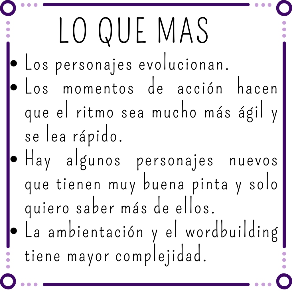 Y aunque en este libro se van haciendo grandes descubrimientos sobre el worldbuilding, hay algo que no se explicar que hace que la ambientación se quede corta y floja para ser el segundo libro de una trilogía.