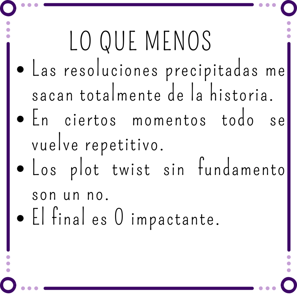 Algún giro me ha sorprendido y me lo he comido pero la mayoría los he visto venir. Y aunque algunas veces no me importa, en este caso se vuelven repetitivos, totalmente ilógicos, innecesarios y un pelín sacados de la manga.