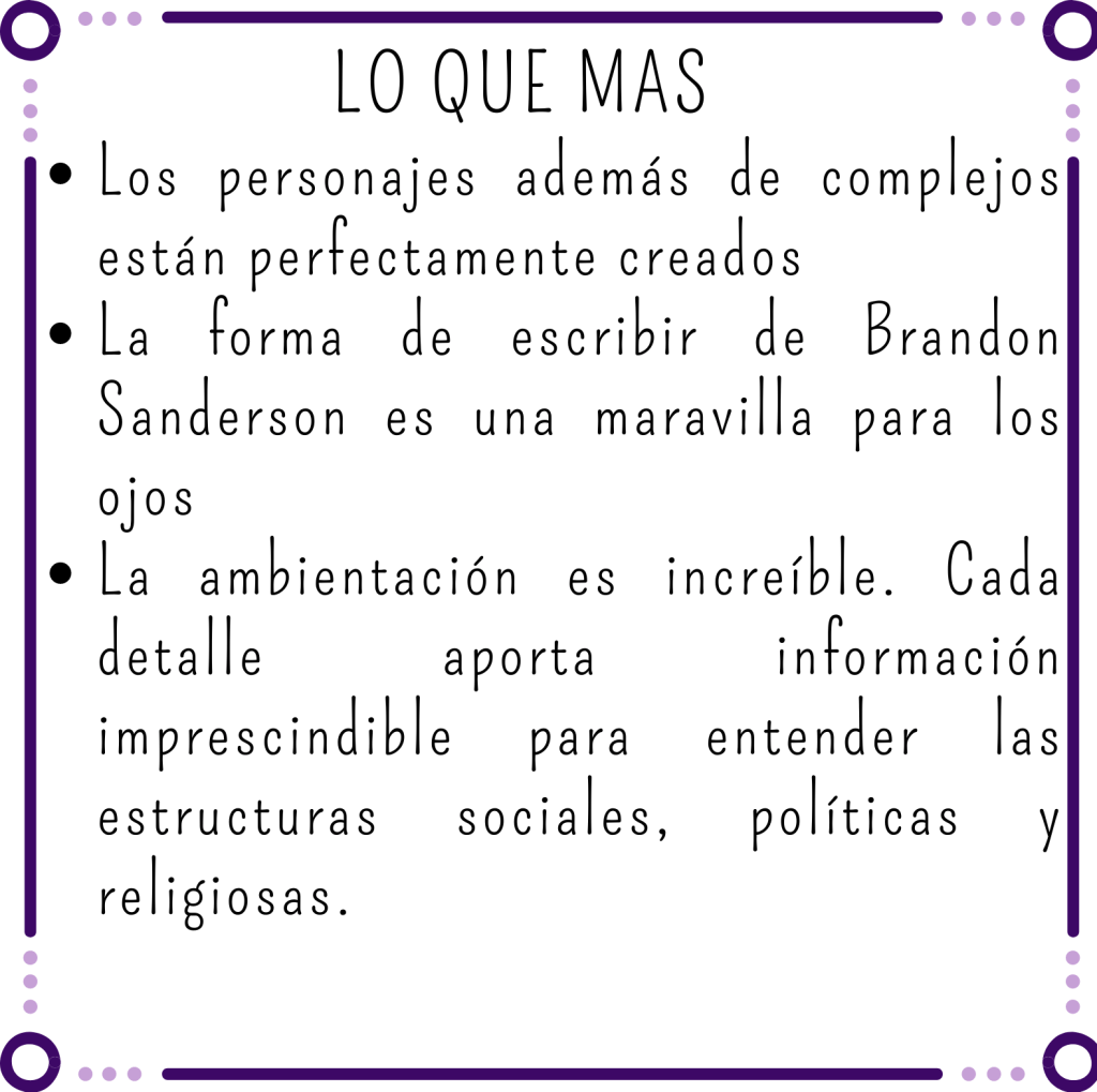 En general es una historia que nos ha gustado porque es otro tipo de fantasía diferente a la que estamos acostumbradas, mucho más compleja y madura, y ha sido muy interesante adentrarnos en el universo creado por Brandon Sanderson. Nos hubiera gustado más dinamismo y tal vez unas subtramas mejor desarrolladas, ya que nos hemos quedado con las ganas de conocer ciertos temas con más profundidad.