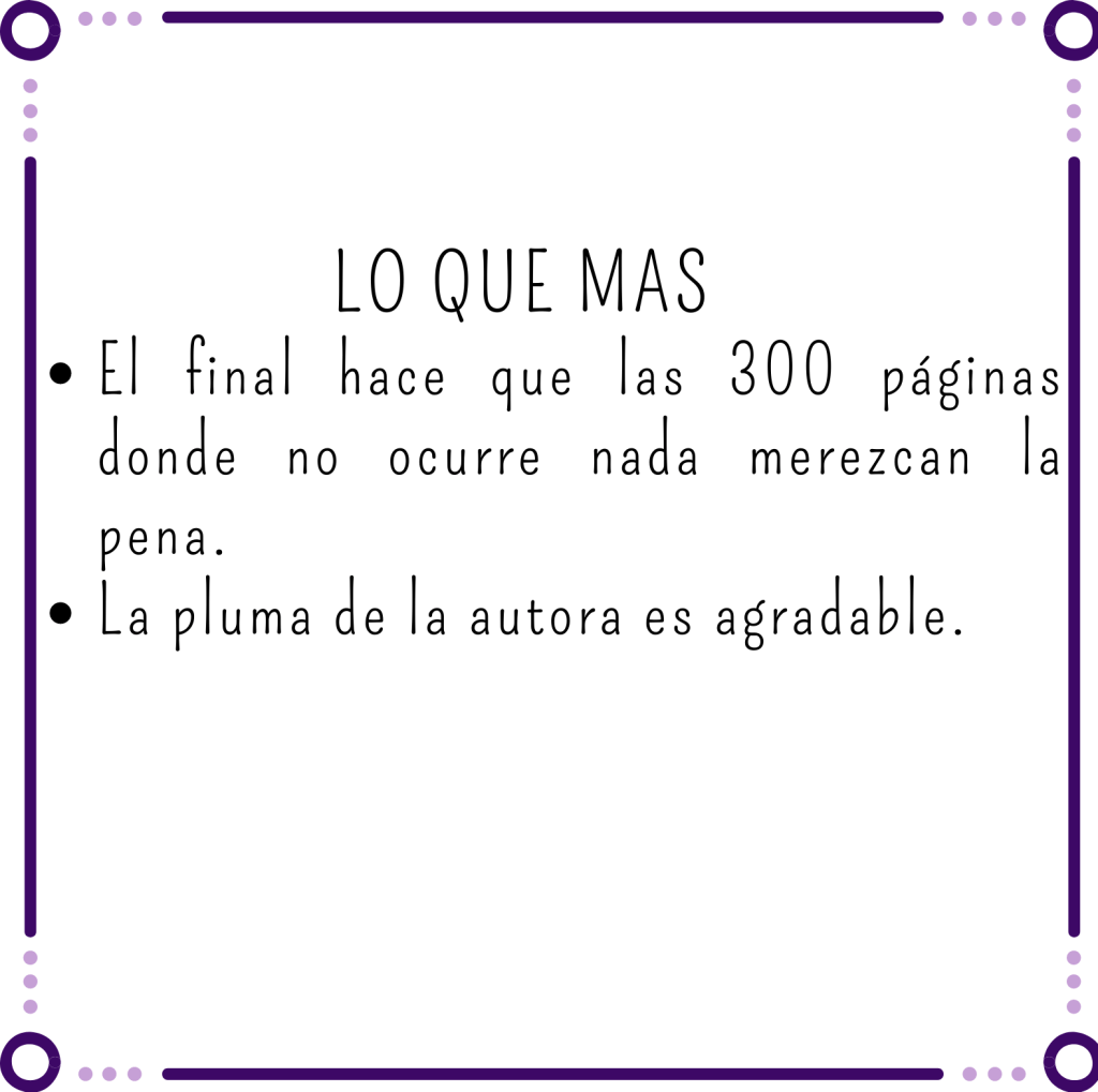 Estuve a punto de abandonar el libro en numerosas ocasiones ya que no encontraba el sentido a perder mi tiempo de esa manera. Pero agradezco mi falta de criterio al no hacerlo, porque de cara al final la historia coge un acelerón que me pilló desprevenida y que me sorprendió gratamente.