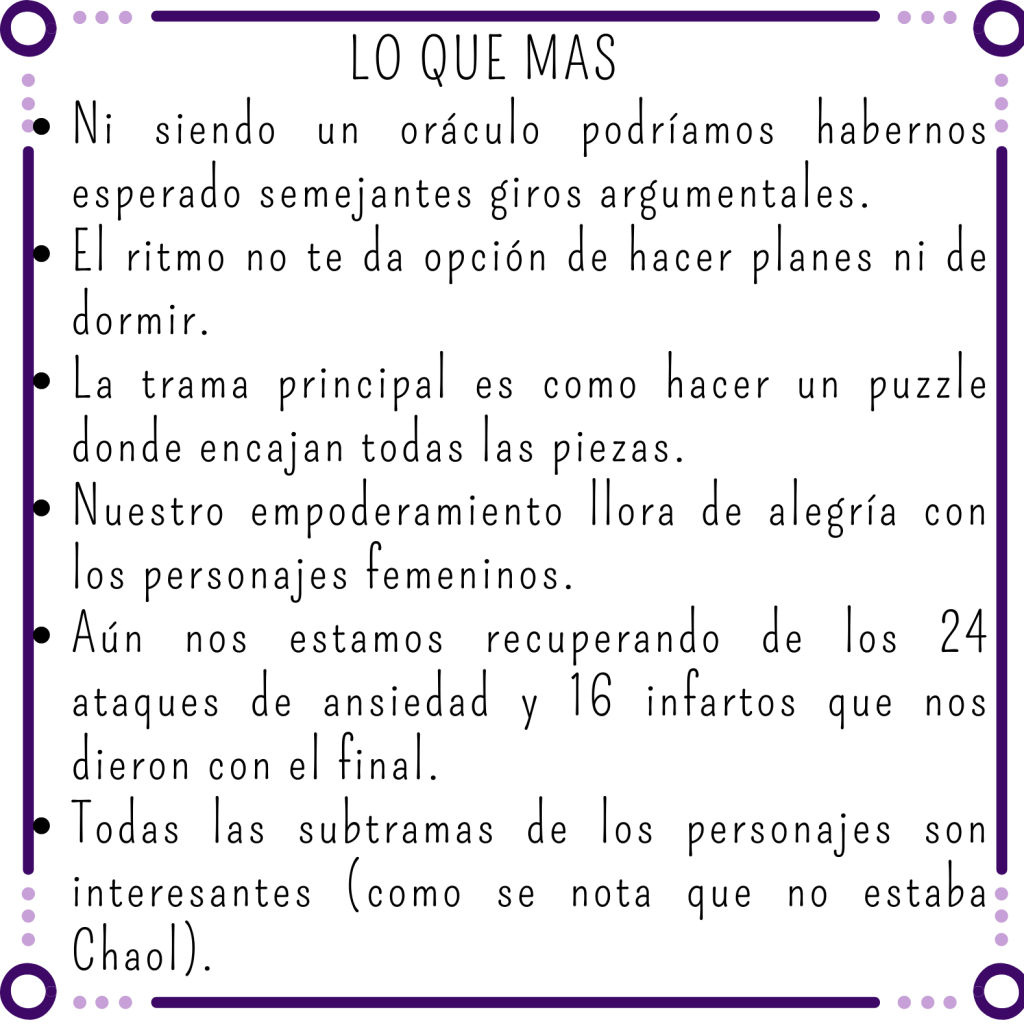 Además, las subtramas de los personajes han hecho que estemos sin pestañear durante horas, porque no ha habido ningún capítulo que no nos haya parecido interesante.