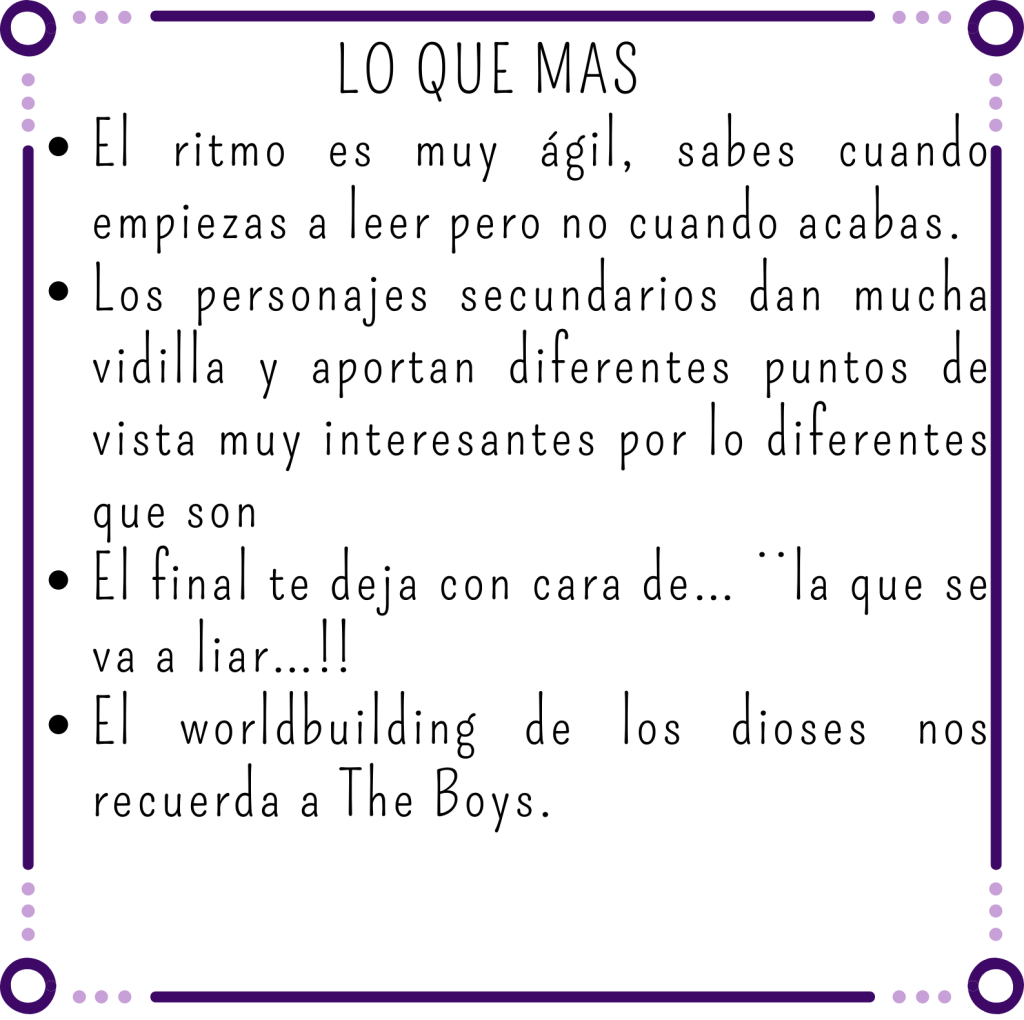 Quienes nos han dado la vida han sido los personajes secundarios. Nos hemos reído con Hermes y sus grandes conversaciones. Hécate, que es la voz de la conciencia de Perséfone, nos encanta, pero a la vez… no sabemos si fiarnos de ella o no. La trama de Apolo es muy interesante para entender la forma de pensar de los dioses y las amigas de Perséfone dan el punto de realidad y problemas que tenemos los simples mortales.