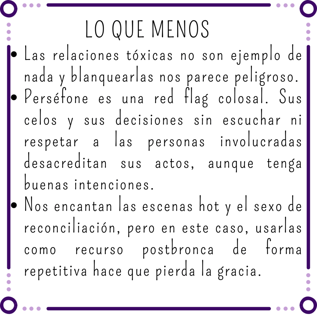 Lo que no nos ha gustado nada es el romanticismo que se le da a los celos y a la posesividad en las relaciones tóxicas. Es terrible como se normalizan ciertas actitudes de Perséfone que luego no tienen repercusión ni consecuencias reales, y que se justifican creando excusas absurdas y sexo de reconciliación sin sentido.