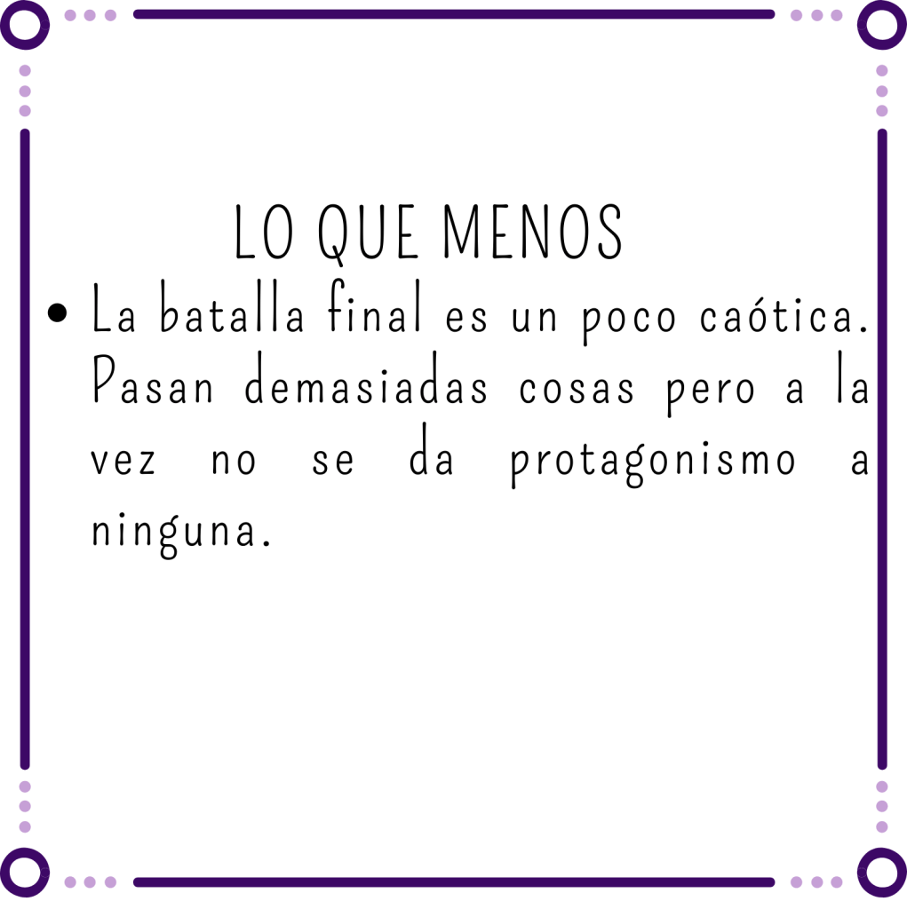 Y eso se va intensificando de cara al desenlace, cuando la batalla final se acerca. Todo lo que puede pasar para que nuestro corazón se detenga ocurre en unas pocas páginas. Hemos de decir que nos gustó, pero quizá nos pareció demasiado caótico.