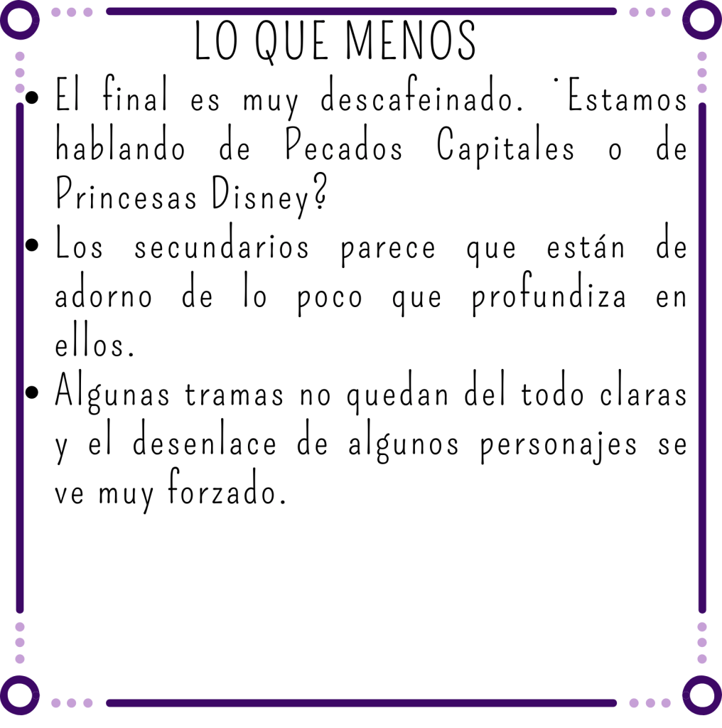 Los villanos también nos han dejado algo frías, principalmente porque no sabemos cómo acaban. Entendimos sus motivaciones, pero meeeh… ¿tanto para luego tan poco?