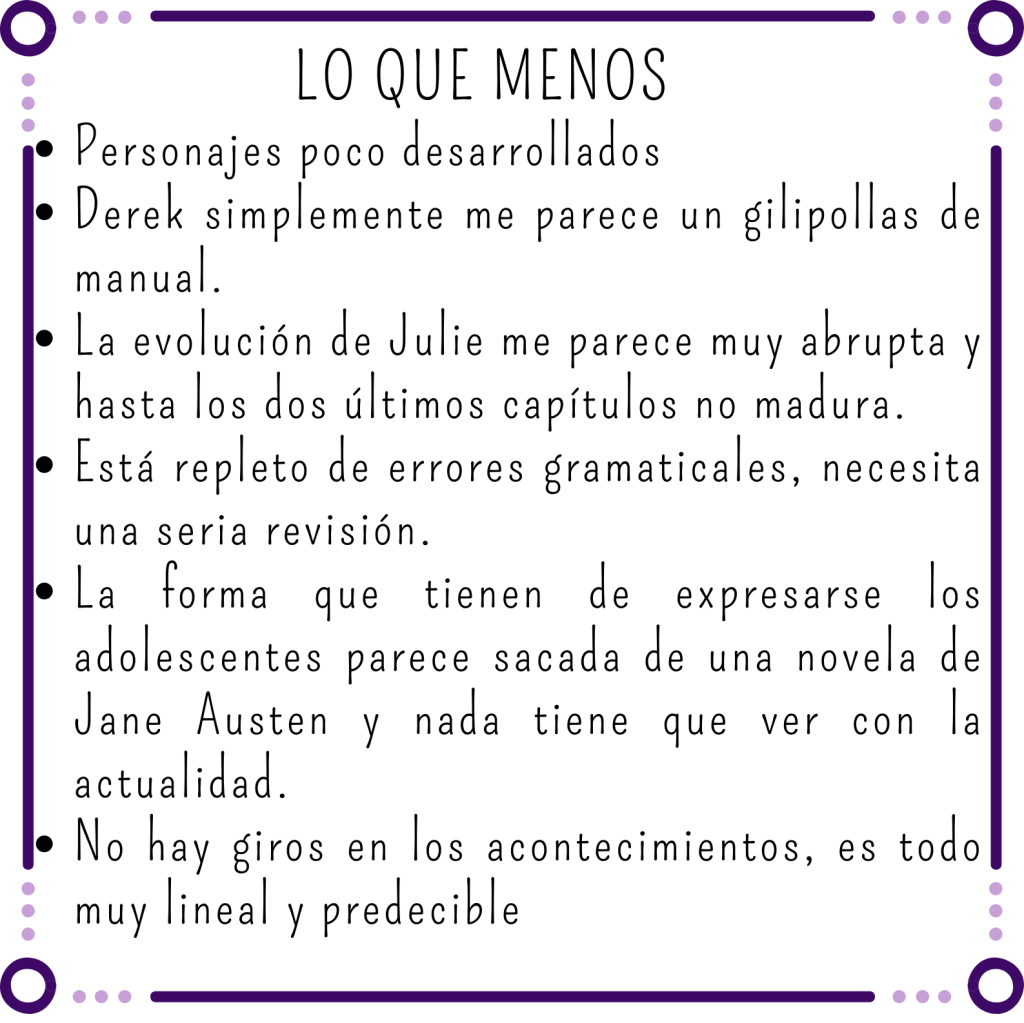 Volviendo a Julie, es el típico personaje que es inocente y que tiene que lidiar con diferentes temas triviales sin saber cómo hacerlo, lo que le hace conectarse con los otros dos protas. A veces, aparecen puntadas de madurez, aunque se cae esa impresión al leer la siguiente frase.