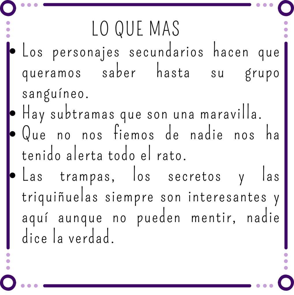 Gracias a todos los dioses que estaban los secundarios. Enriquecen la historia desde el minuto uno, y aunque no nos fiamos de ninguno, todos nos parecen personajes complejos de los que solo queremos saber hasta su grupo sanguíneo. Nos han dado la vida.