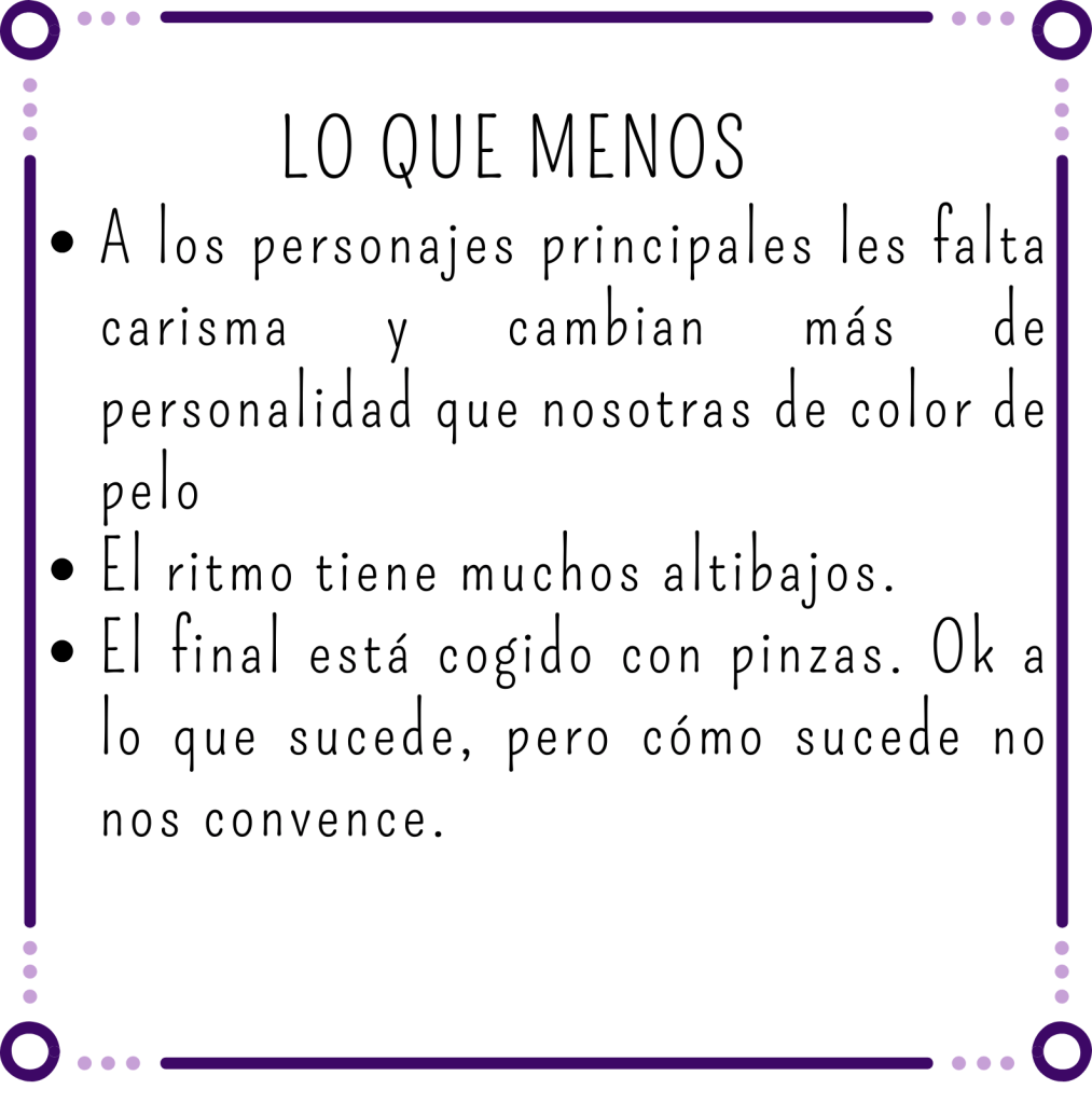 La verdad es que el libro empezó muy fuerte pero a medida que íbamos leyendo muchas subtramas, que a nosotras nos parecían interesantísimas, se fueron desinflando. Algunas desaparecen y otras se resuelven de manera totalmente absurda.