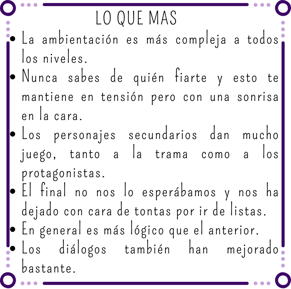 En general nos parece que este libro ha mejorado notablemente la saga y nos ha parecido más entretenido e interesante que el primero.
