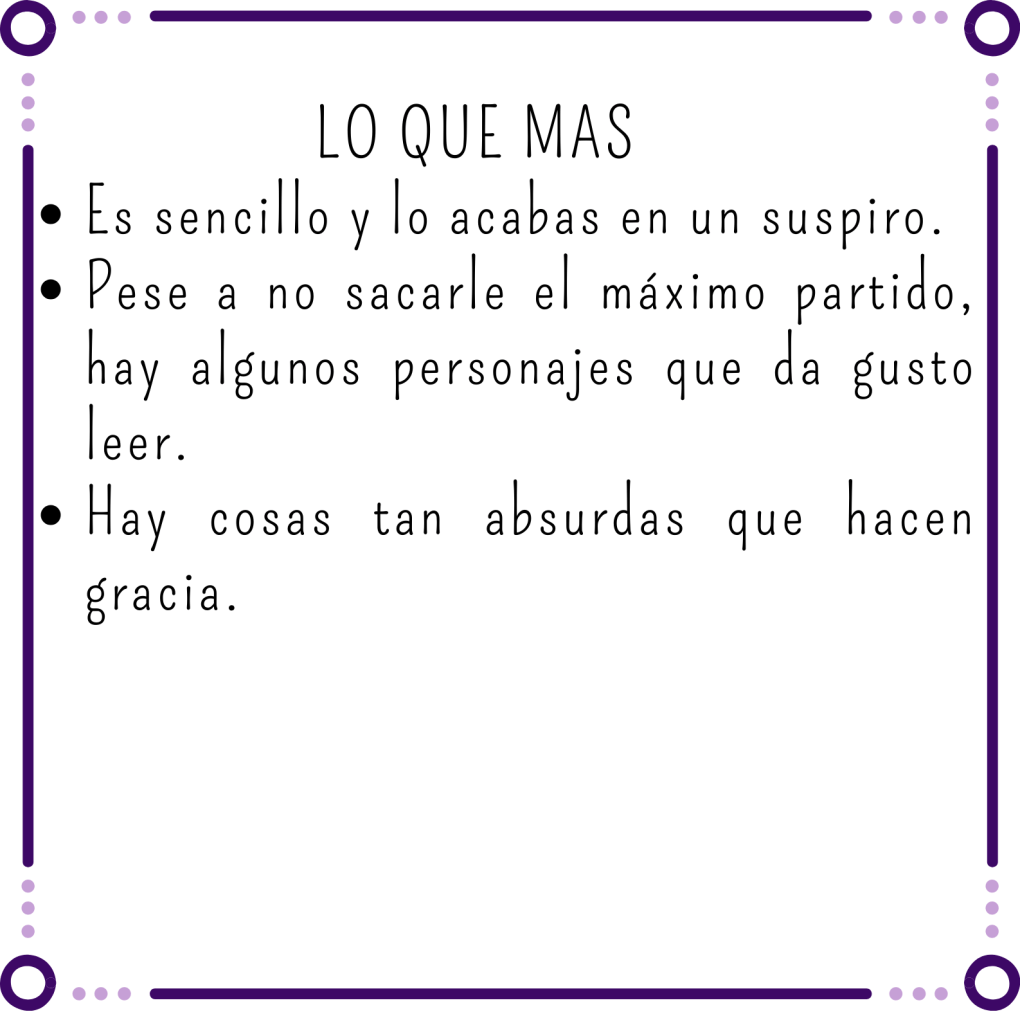 El ritmo es ágil y sencillo de leer, pero chiquis… aquí se dan trescientas vueltas para llegar a lo “interesante”. Hay 0 complejidad y la poca que hay ni se explica ni se aprovecha.