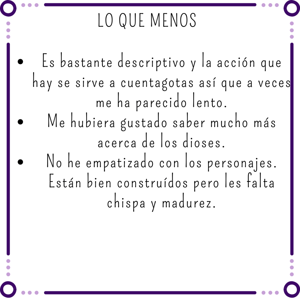 La ambientación física está muy lograda pero la mitológica a mi me ha parecido un poco sin más. Se habla de los Dioses pero poco se sabe de ellos. No los he llegado a imaginar en ningún momento. Cuentan un poco por qué dos de ellos están en guerra pero a mi el conflicto sinceramente no me ha terminado de convencer.