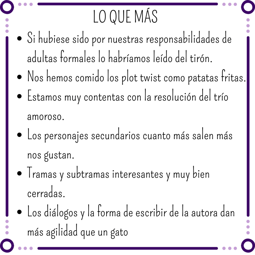 Por si fuera poco, los diálogos y la forma de escribir de la autora dan más agilidad que un gato, así que si nos duró más de dos días fue porque teníamos que hacer cosas de adultas responsables, porque si por nosotras hubiese sido lo habríamos leído del tirón.