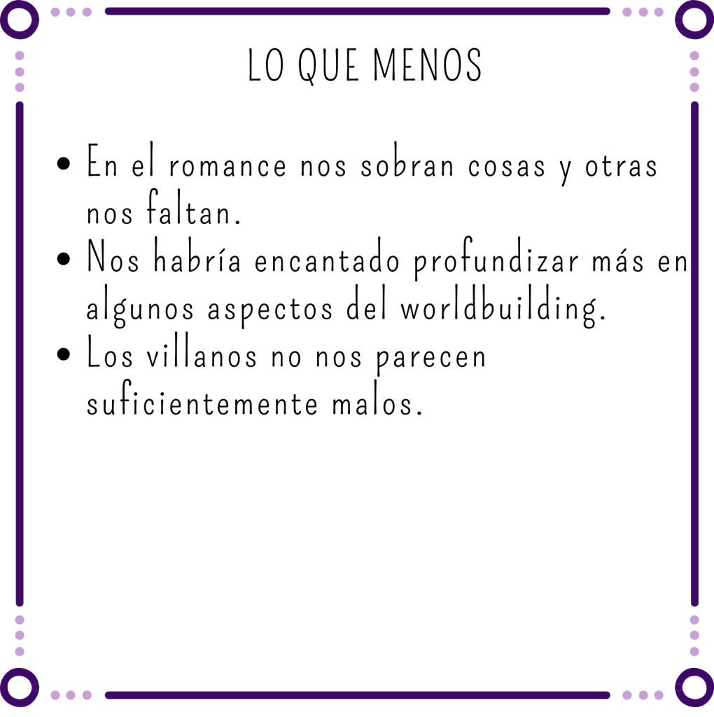 Hay cosas del worldbuilding que nos habría encantado profundizar por la buenísima pinta que tienen, pero bueno, lo que sabemos nos gusta así que con eso nos quedamos.