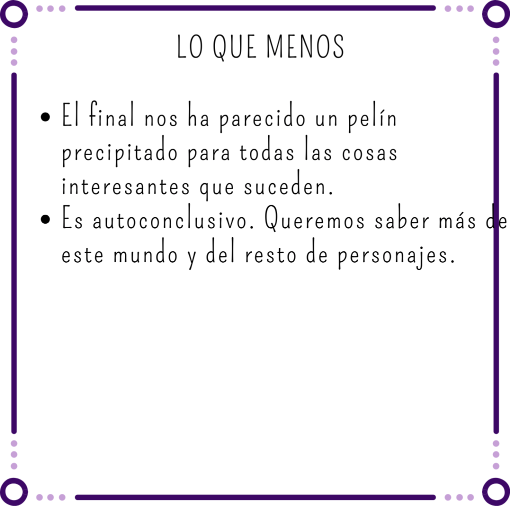 De cara al final nos ha dado la sensación de que todo se acelera y se emborrona un poco. Nos ha gustado lo que pasa porque además hay giros que no esperábamos, pero creemos que la forma de resolver algunos conflictos hacen que todo se vuelva precipitado en comparación con el resto del libro.