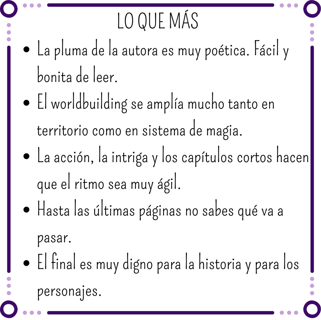 Una cosa que en el anterior libro no me quedó muy clara es el sistema de magia. En este caso se desarrolla mucho más, tiene más importancia y además también se descubren nuevas especies que han enriquecido el worldbuilding.
