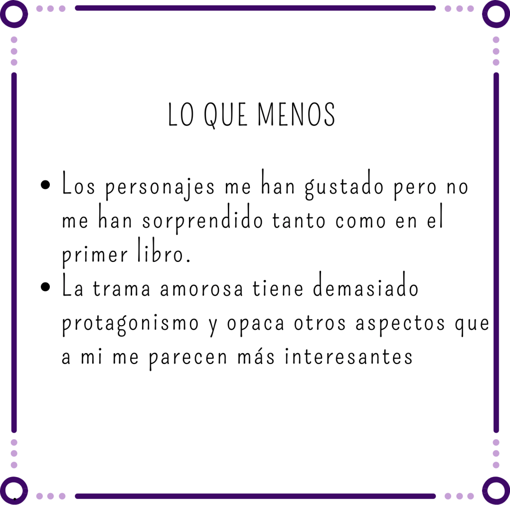 En este libro los personajes principales tienen todo el peso de la historia y aunque me gustan y me ha encantado su evolución, también he sentido que su trama amorosa tiene demasiado protagonismo y opaca otros aspectos que a mi me parecen más interesantes.