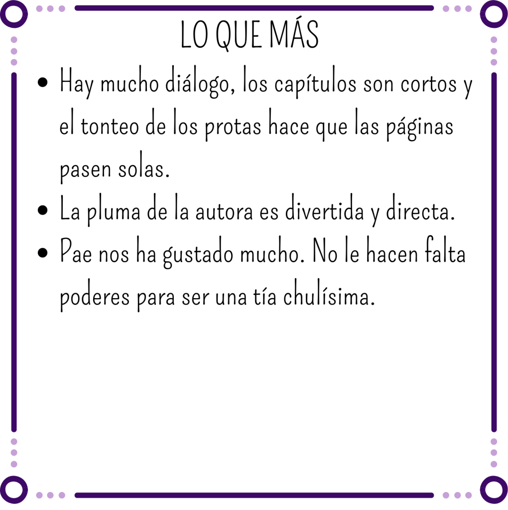La pluma de la autora nos ha encantado por lo directa y graciosa que es. Hace que se visualicen muchas situaciones y eso está muy bien.