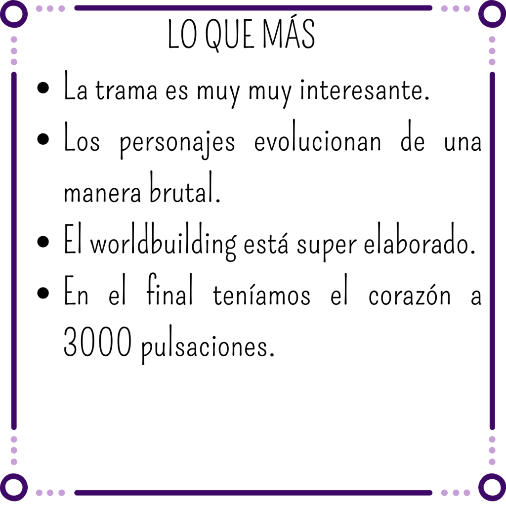 El worldbuilding es bastante complejo y en el primer 30% íbamos un poco perdidas. Se da mucha información y cuesta asentarla, pero tan pronto lo haces, es una delicia.