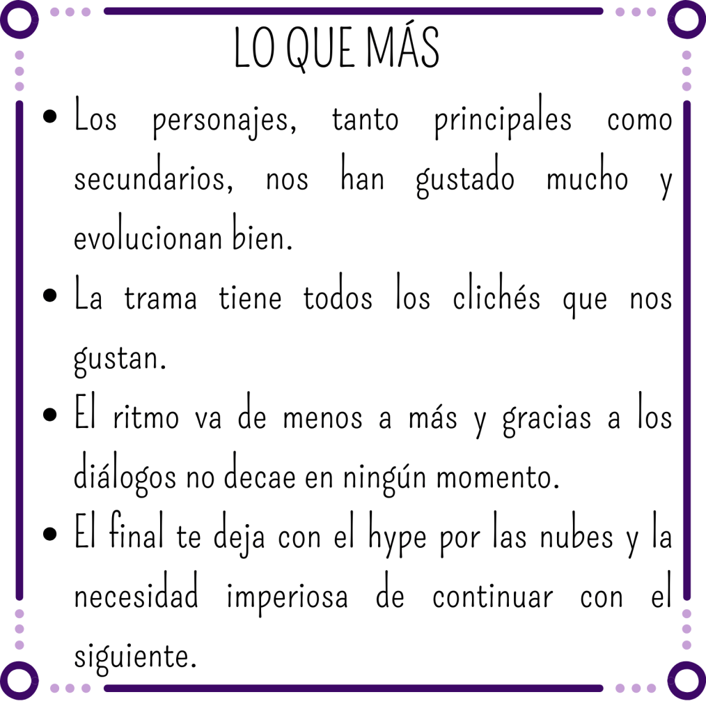 Habríamos agradecido mayor complejidad en el mundo creado por la autora y mayor desarrollo de ciertas subtramas, pero también os decimos que nos da en la nariz que lo gordo está por venir.