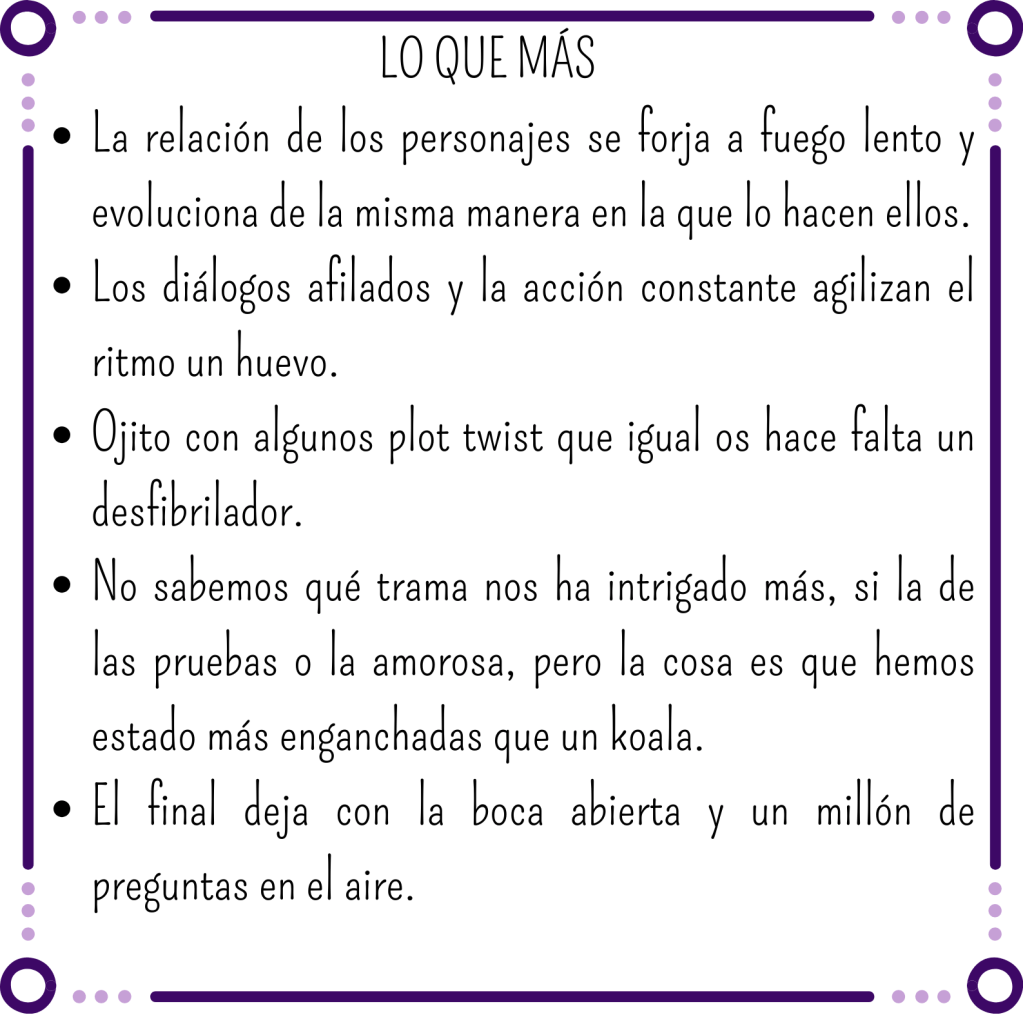 Quizá el primer 50% es más pausado porque se trata de un libro introductorio y tiene ciertos altibajos, pero la intriga por saber qué ocurre tanto con las pruebas como con los personajes, da ese toque adictivo que hace que no puedas aparcar el libro ni un segundo.