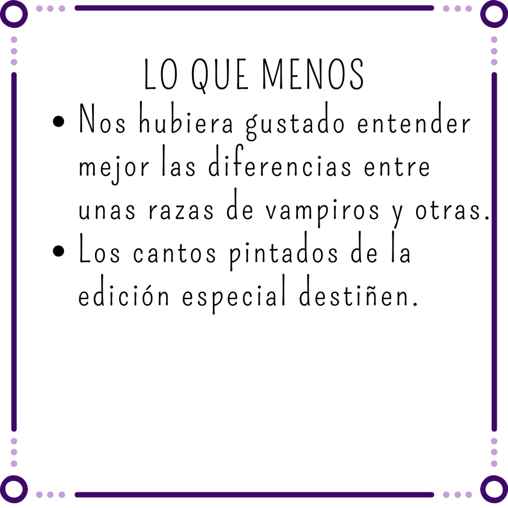 El worldbuilding nos ha parecido original porque hay diferentes tipos de vampiros, aunque al principio nos costó un poco. Nos hubiera gustado entender más desde el inicio las diferencias entre unos y otros y sus habilidades.