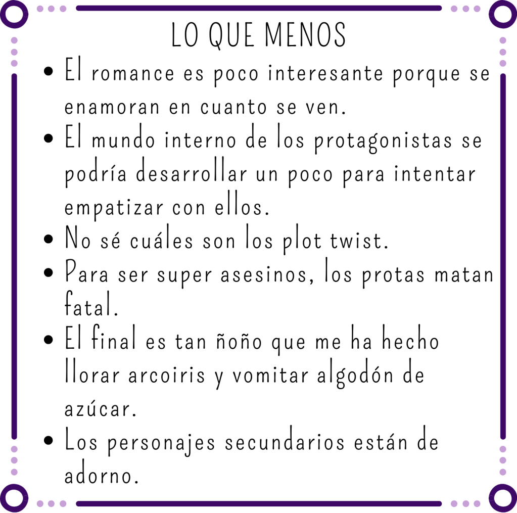 Y el final es ñoño. Sí, chicas, ñoño. ¿Pero no es un dark romance de asesinos? ¿cómo puede ser cursi? Pues no sé hijas mías, preguntadle a la autora, porque a mi había momentos que me estaba dando tango cringe que pensaba que iba a llorar algodón de azúcar y a vomitar arcoiris.