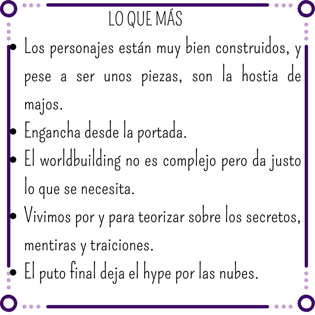 Ha escrito unos personajes complejos y bien construidos, que nos han caído genial a pesar de que no nos fiamos de ninguno ni un pelo. Sabemos que siguen guardando secretos que esperamos descubrir en el futuro.
