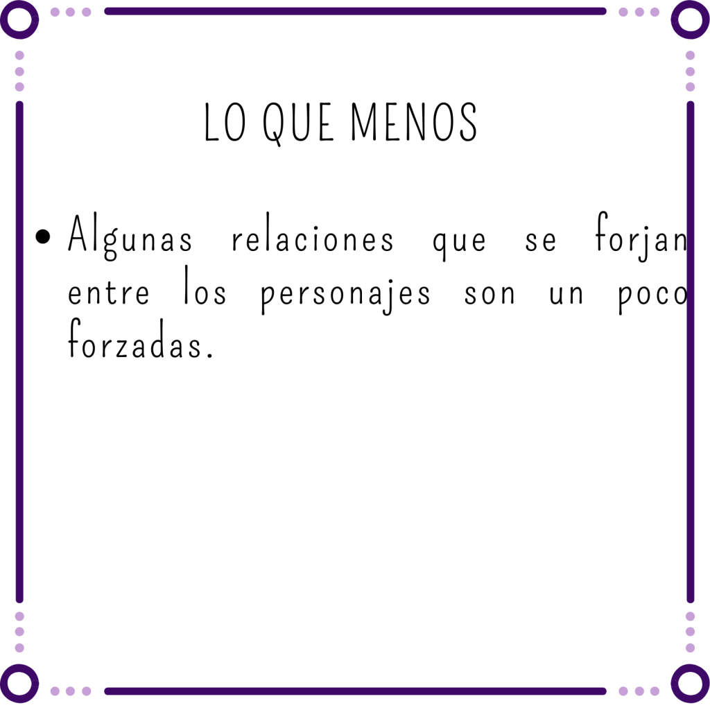 Sólo ha habido una cosa de los personajes que no nos ha motivado del todo, y son las relaciones amorosas que nacen entre ellos. Nos han parecido demasiado forzadas y convenientes y no han aportado demasiado a la trama. No nos han sacado de la historia pero las hemos ignorado un poco.