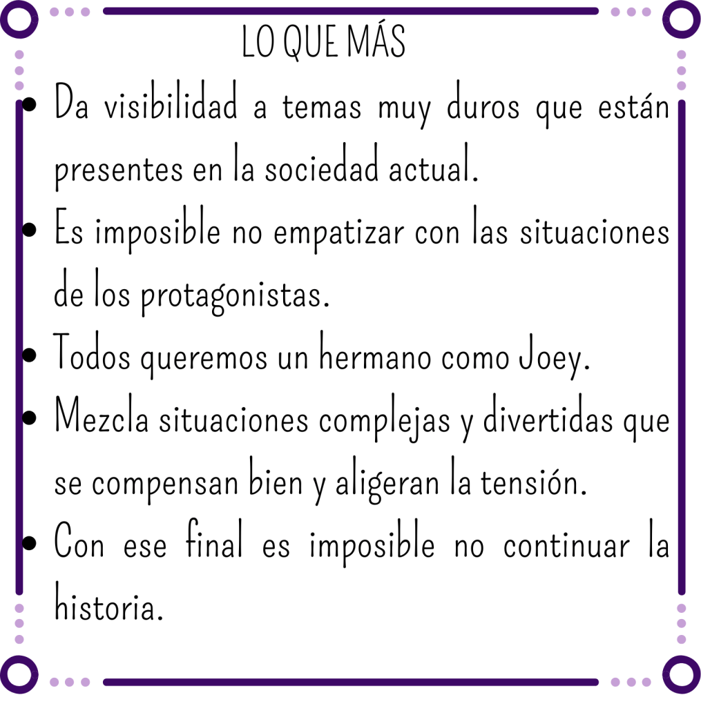 Los personajes secundarios nos han encantado, sobre todo Joey, que es el hermano que todo el mundo desearía tener y del que estamos deseosas de saber más de su historia. Por otro lado Claire y Gibsie también son majísimos. Ellos nos dan el punto de vista de la amistad de verdad, aunque en algunas de sus conversaciones nos ha dado muchiiiiiisimo cringe.
