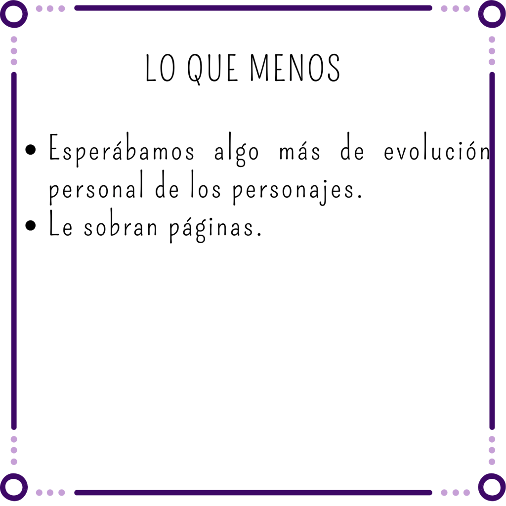 Es cierto que pasan cosas que no esperábamos y que la tensión que hay entre ellos es lo que mantiene el enganche, pero en general, en este tipo de libros tampoco esperamos unos giros de 180º, ni los necesitamos.
