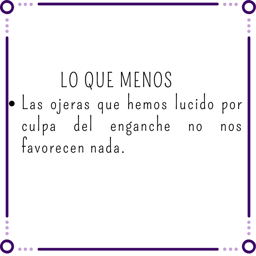 Sin duda, esta autora sabe qué botón tocar para parar nuestras vidas de personas responsables y engancharnos a sus historias sin importar que por las mañanas nuestras ojeras nos lleguen hasta las rodillas.