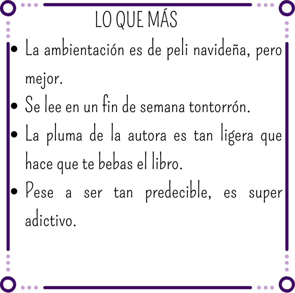 En resumen, que hemos disfrutado la historia porque es entretenida y totalmente acorde con estas fechas. ¿Nos ha cambiado la vida? pues no, pero tampoco es lo que buscábamos. Queríamos algo de corazón calentito, que combinara bien con el frío de la calle, el sofá, la manta y un café con canela. Y sin duda cumple con lo prometido.