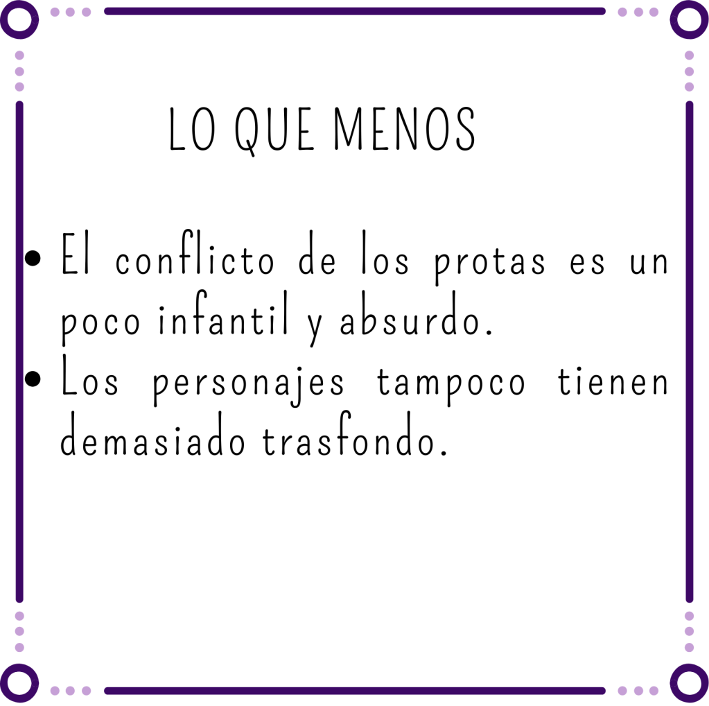 No hay grandes plot twist, pero es que la historia no los necesita para mantenerte pegada a las páginas. Hay algunas cosas que sorprenden pero más por las salidas y actitudes de los personajes que porque la trama da un giro de 180 grados.