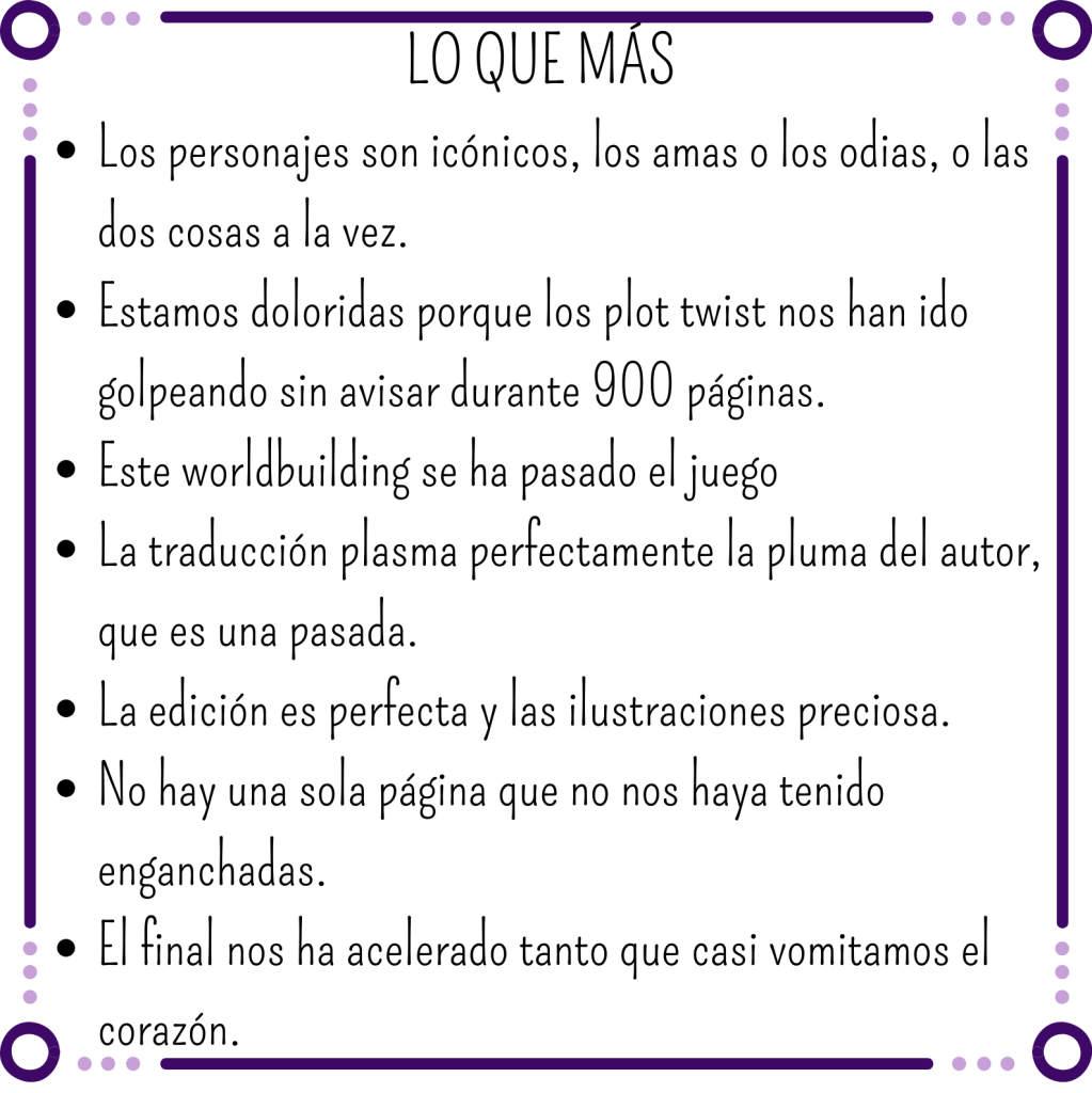 Y aunque la historia puede parecer lineal, ya que no dejan de ser una memorias, hay muchísimas cosas que nos han dejado con la boca abierta, en algunos momentos (y a pesar del tiempo que ha pasado de un libro a otro) nos hemos dado cuenta de las miguitas que ha ido dejando por el camino desde el primer libro, asi que algun plot twist os va a golpear en la cara como nosotras.