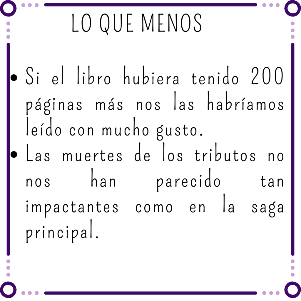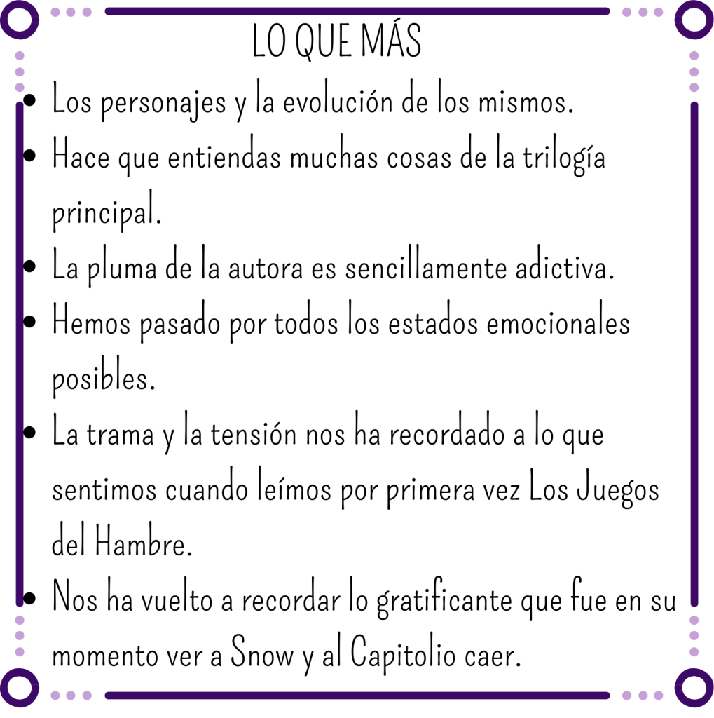 Ha sido un viaje increíble. Cuando leímos Los Juegos del Hambre dimos por hecho muchas cosas de algunos personajes, pero este libro nos ha puesto un punto en la boca y nos ha vuelto a recordar lo gratificante que fue en su momento ver a Snow y al Capitolio caer.