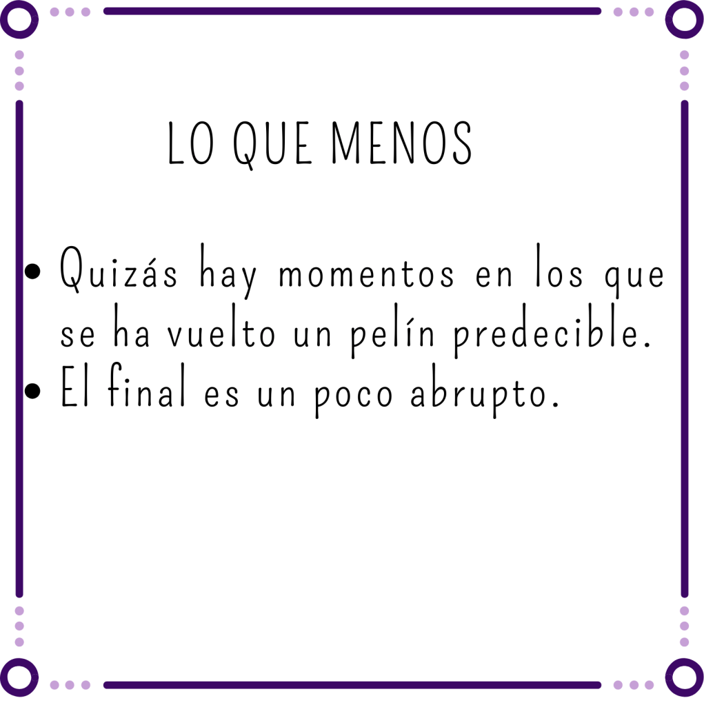 No hay grandes giros ni nada que sorprenda demasiado, porque como tenemos los dos puntos de vista, sabíamos lo que pensaban y lo que sentían ambos protagonistas. Eso nos ha ayudado a conocerlos y entender por dónde estaban transitando, pero por otra parte, se pierde un poco la intriga.