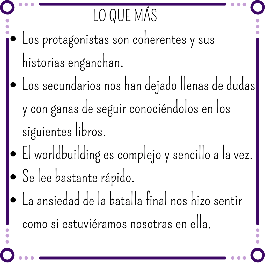 Los personajes secundarios nos han gustado mucho y nos han dejado llenas de dudas y preguntas. Estamos deseando continuar con los libros para conocer más a fondo a muchos de ellos.